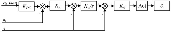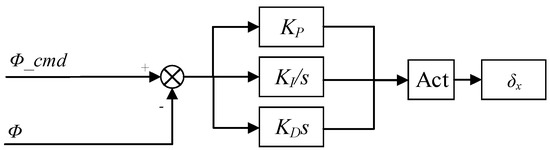 For the design of controllers based on the small-perturbation linearized model of the missile, a three-loop control structure is adopted for the longitudinal channel (Figure 11), which is composed of the rate loop, synthetic stability loop, and accelerometer feedback loop with feedback gains K g , K ω , and K A for each loop, respectively; K D C is the control command gain. A PID controller is implemented for the roll channel (Figure 12), where K p is proportional gain and K I and K D are the integrator and derivative coefficients, respectively.