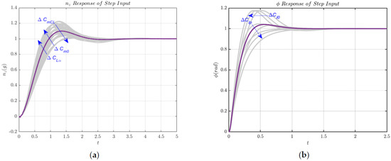 The effects of the aerodynamic derivative deviations observed in the linear system eigenvalue analysis (Figure 5) are consistent with the time domain simulation results (Figure 9). Across various time domain performance metrics, the fundamental modal characteristics of the system remain largely unchanged. Deviation tests do not alter the overall stability of the system or the primary steady-state convergence values.
