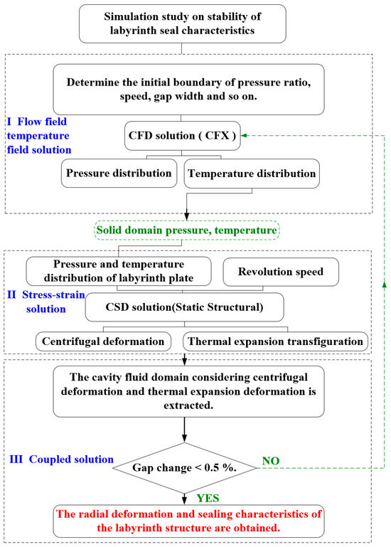 This paper utilises a bidirectional fluid–solid-thermal coupling sequential solution approach, as depicted in Figure 1, which illustrates the flow chart of the numerical simulation analysis. An analysis of the stability of sealing characteristics is conducted for the labyrinth seal structure. The precise procedure is as follows: