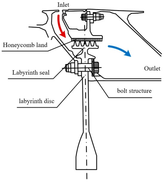 The labyrinth seal is a crucial, non-contact, dynamic sealing mechanism. It utilises the convoluted leakage pathway created by the tooth cavity architecture to efficiently mitigate leakage by multi-stage throttling expansion and kinetic energy dissipation of the fluid. Due to its considerable benefits of negligible wear, exceptional reliability, and prolonged lifespan under conditions of high speed, elevated temperature, and intense pressure, enhancing the efficiency of rotating machinery is crucial for ensuring operational safety and maintaining rotor stability. Consequently, labyrinth seals are extensively employed in the essential components of turbine machinery, including gas turbines, steam turbines, aviation engines, compressors, and pumps. The labyrinth plate of the aero-engine frequently features a bolted connection structure. As the turntable spins rapidly, the labyrinth plate experiences radial elongation due to centrifugal force. Simultaneously, the wind resistance of the bolt and the labyrinth plate generates significant heat, leading to radial elongation of the labyrinth plate, which reduces the working gap and diminishes the sealing flow of the labyrinth. Upon reduction in the flow rate, the temperature increase due to wind resistance becomes more pronounced, further exacerbating the elongation of the labyrinth plate, thereby creating a detrimental cycle. Ultimately, when the turntable’s temperature exceeds acceptable limits, the sealing properties of the labyrinth diverge from the intended specifications, potentially leading to friction within the labyrinth, thereby compromising the engine’s safe and stable operation [1,2].