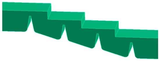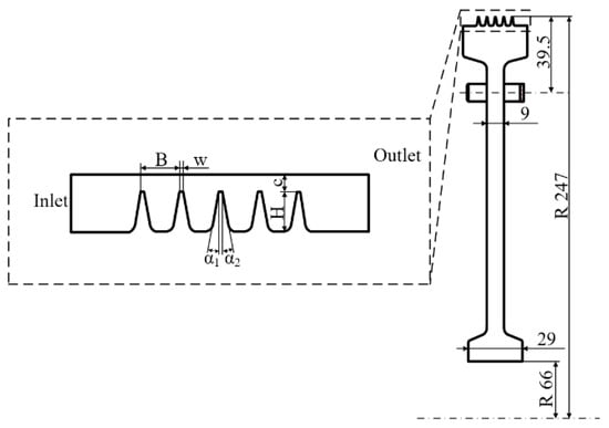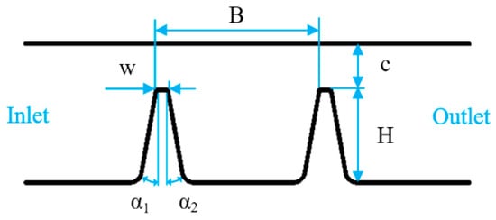 Figure 3 illustrates the schematic diagram of the structural properties of the labyrinth teeth examined in this study. The primary structural characteristics include the following: seal clearance c, number of labyrinth teeth N, tooth spacing B, height of labyrinth teeth H, tooth top width w, forward inclination angle α1, backward inclination angle α2, among others. The precise parameters are presented in Table 1, and the numerical simulation model is illustrated in Figure 4.
