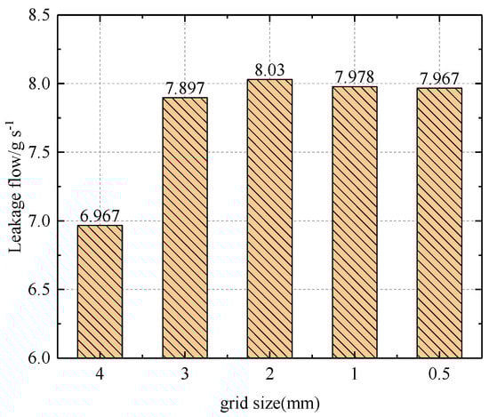 Table 2 and Figure 5 present the primary mesh tooth size, mesh number, and flow calculation outcomes for the five grid sets. The graphic demonstrates that a mesh size of 0.5 mm yields a relative error of 0.14% compared to the flow calculation result of 1 mm, which meets the specified standards. Figure 6 and Figure 7 depict local grids with grid scales of 1 mm and 0.5 mm, respectively.