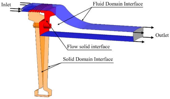 The boundary for the fluid–solid coupling computation is defined as illustrated in Figure 8 and Table 3. The ideal gas serves as the fluid medium, with the static pressure boundary set at the outlet and the total temperature and total pressure boundaries specified at the inlet. The SST k-Omega turbulence model has been chosen as the turbulence model. The periodic boundary is established on both sides of the fluid and solid domains of the labyrinth, the coupling heat transfer boundary is defined at the interface between the fluid and solid domains, and the wall condition is designated as no slip.