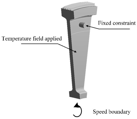 A fixed constraint is imposed on the mounting bolt of the labyrinth plate to restrict its radial displacement; the velocity boundary is applied to the labyrinth plate; the temperature field boundary, computed by CFD 19.2 software, is applied to the entire solid domain of the labyrinth plate to assess the deformation resulting from the combined effects of centrifugal force and thermal resistance due to wind. The specific solid domain boundary conditions are shown in Figure 9.