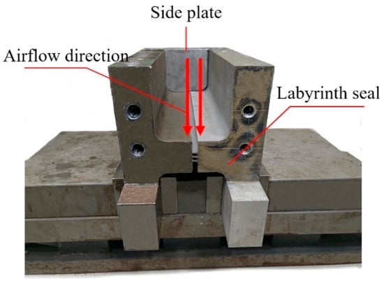 An experimental apparatus to assess the leaking characteristics of labyrinth seals was conceived and constructed [29]. The test portion consists of a detachable and replaceable labyrinth test component and a sealing element. The assembly configuration is illustrated in Figure 11. The bottom end of the test specimen is secured and calibrated using a dual-direction precision vice to modify the sealing gap between the labyrinth test specimen and the sealing component. The upper portion of the test specimen is secured with bolts to an adjustable inlet segment. Figure 12 illustrates the labyrinth seal test specimen, whereas Figure 13 and Table 5 provide the precise dimensional specifications of the labyrinth seal test specimen. The sealing gap was adjusted with the stopper ruler during the experiment. Following the modification and securing of the gap, its dimensions were remeasured using the stopper ruler to ensure precision. The exit pressure is atmospheric, and the leakage characteristics at different pressure ratios are ascertained by adjusting the inlet pressure.