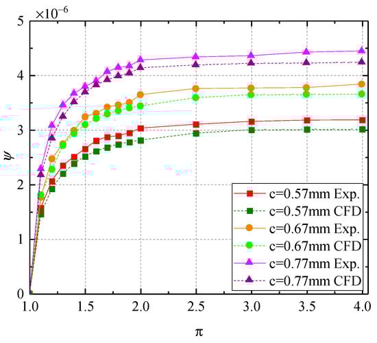 where m represents the mass flow rate in kg/s; denotes the total inlet temperature in K; indicates the total inlet pressure in Pa. Figure 14 illustrates the trend of the actual and simulated values of the conversion flow of the labyrinth test specimen in relation to the pressure ratio. The chart indicates that the overall pattern of the experimental results aligns well, with the experimental data generally exceeding the simulation data, particularly exhibiting higher errors at lower pressure ratios. The greatest inaccuracy of a 0.57 mm gap is 7.72% at a pressure ratio of 1.1. The largest mistake of 0.67 mm occurs at a pressure ratio of 1.2, with a maximum error percentage of 8.56%. The highest mistake of 0.77 mm occurs at a pressure ratio of 1.2, with a maximum error percentage of 8.14%. The reliability of the numerical method utilised in this study is validated.