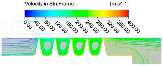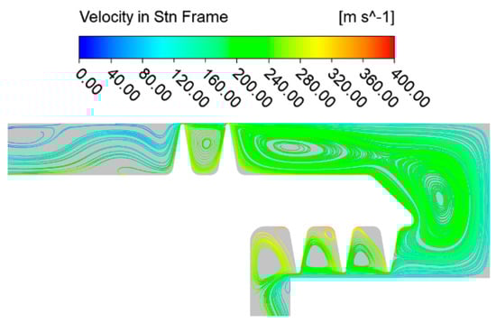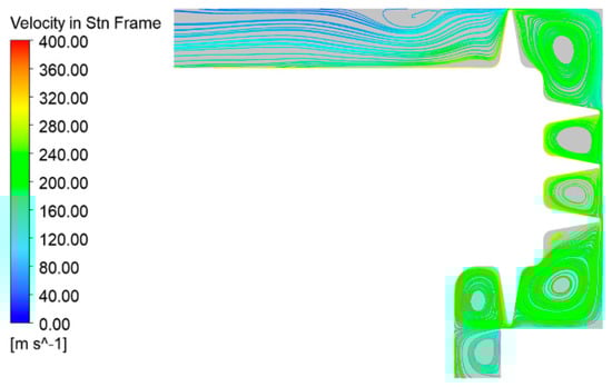 Figure 16 depicts the meridian streamline diagram for the conventional configuration at a pressure ratio of 2.0 and a rotational speed of 15,000 revolutions per minute. The streamline diagram illustrates that as airflow traverses the gap between the labyrinth and the stator wall, a throttling effect occurs due to the abrupt decrease in flow area, resulting in diminished static pressure and augmented flow velocity. A jet is generated after traversing the sealing gap. A portion of the airflow enters the tooth cavity, creating a vortex, while the remaining airflow traverses along the stator wall to the subsequent stage of the labyrinth gap.