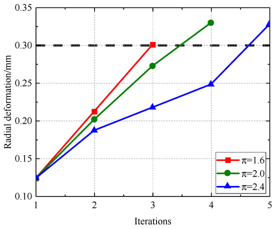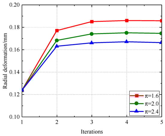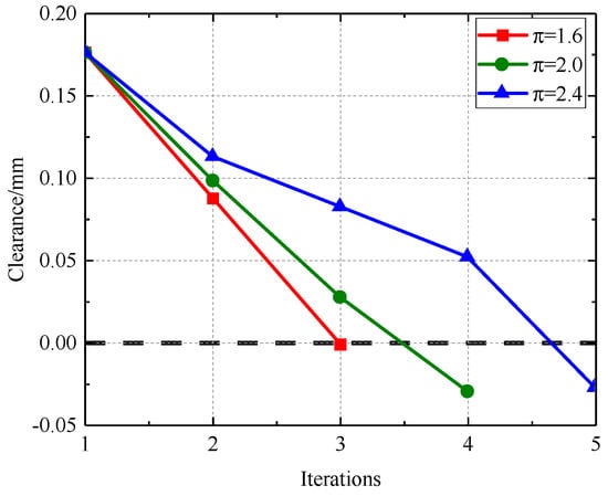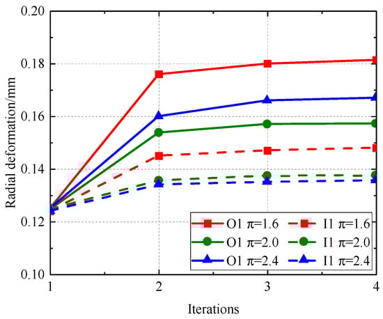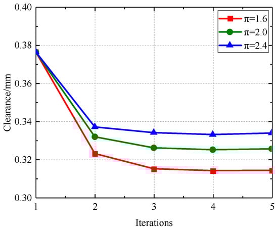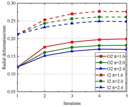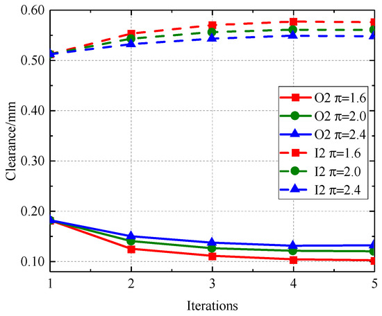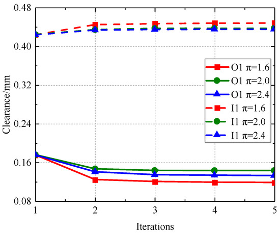 Figure 30, Figure 31, Figure 32 and Figure 33 illustrate that as the pressure ratio increases during iteration to a stable state, the radial deformation of the labyrinth disc progressively diminishes, the sealing gap of the outer ring labyrinth gradually decreases, and the sealing gap of the inner ring labyrinth progressively increases. The leakage flow rate escalates with an increased pressure ratio, but the temperatures of both the fluid and solid domains diminish as the pressure ratio ascends. The increased pressure ratio enhances the flow rate in the cavity, resulting in improved heat dissipation, hence lowering the temperatures of both the solid and fluid domains. This consequently causes radial deformation as a result of wind resistance and centrifugal forces.