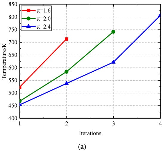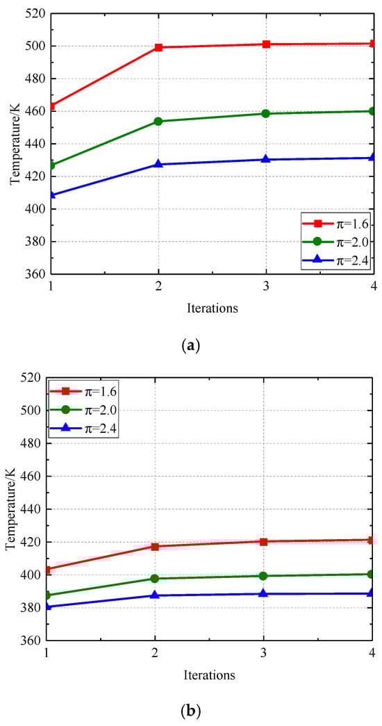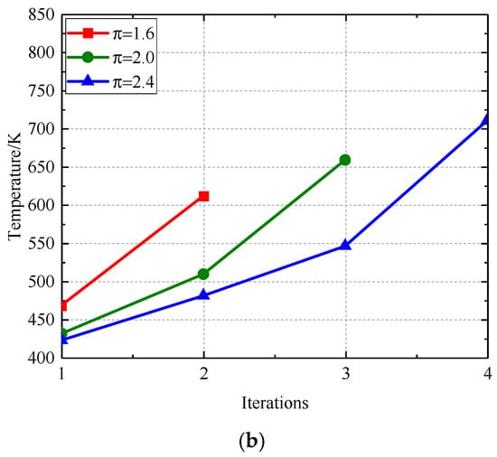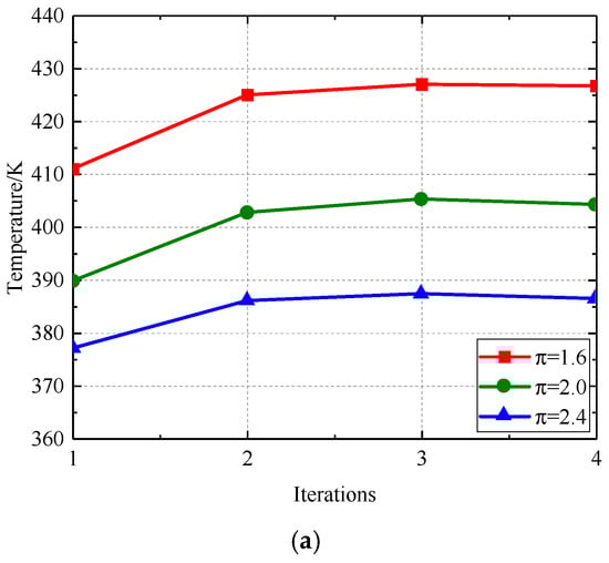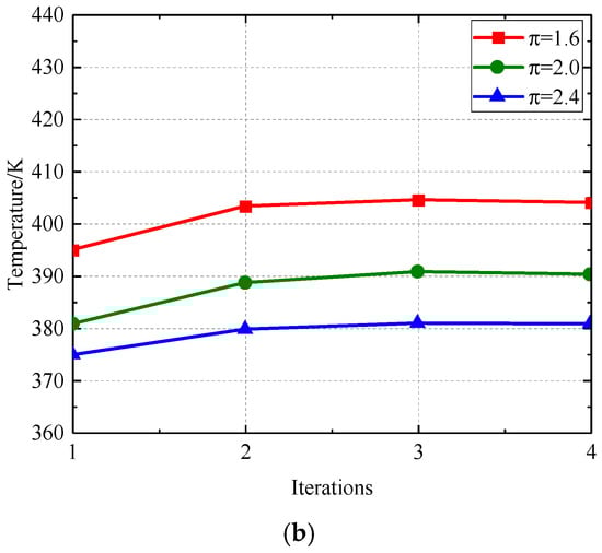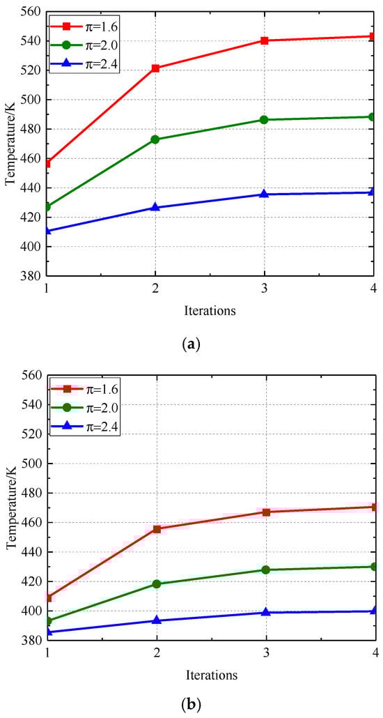 Figure 17 and Figure 18 illustrate the correlation between the radial deformation of the labyrinth disc and the sealing gap with respect to the number of iterations. Figure 19 and Figure 20 illustrate the temperature variation within the computational domain and the leakage flow via the labyrinth sealing gap, respectively. Following centrifugal analysis, the traditional arrangement undergoes radial deformation, leading to a reduction in the sealing gap and a diminished flow rate via the labyrinth seal gap, which therefore results in a temperature increase. The application of the temperature field to the labyrinth disc results in an augmented radial deformation due to the synergistic effects of centrifugal force and thermal expansion from the rotating disc. As a result, the flow through the sealing gap and labyrinth seal decreases, leading to increased temperatures in both the fluid and solid domains. With an increase in the number of repetitions, the radial deformation, clearance, leakage flow, and temperatures of both the fluid and solid domains tend to reach a state of equilibrium.