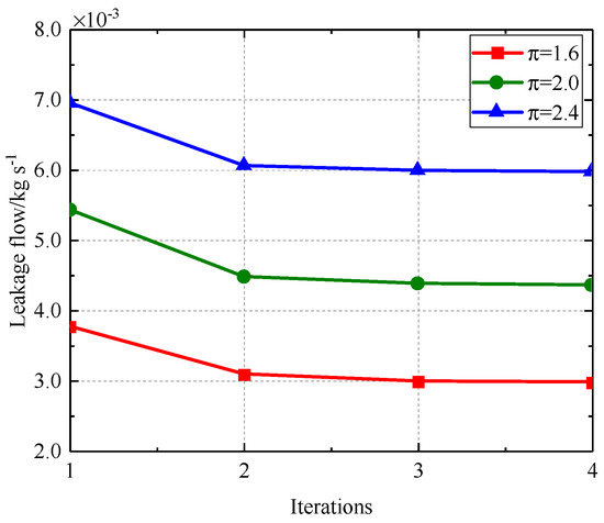 When the cold gap measures 0.3 mm, the alterations in radial deformation and sealing gap for the enhanced configuration A are illustrated in Figure 30 and Figure 31, while the temperature variations within the calculation domain and the leakage flow through the labyrinth seal gap are depicted in Figure 32 and Figure 33. Figure 30 and Figure 31 illustrate that when the number of iterations grows, the radial distortion of both the inner and outer ring labyrinths progressively escalates. The outer ring labyrinth gradually nears the stator wall, causing a reduction in the sealing gap; in contrast, the inner ring labyrinth slowly withdraws from the stator wall, resulting in an expansion in the sealing gap. The sealing effectiveness of the outer ring labyrinth has improved, whereas that of the inner ring labyrinth has decreased. Analysis of the leakage flow rate depicted in Figure 33, in conjunction with the temperature variations at the monitoring point illustrated in Figure 32, reveals that the sealing performance diminishes due to radial deformation caused by the denser arrangement of labyrinth teeth in the inner ring, while the sealing efficacy of the less densely distributed labyrinth teeth in the outer ring is enhanced. The alteration in the sealing efficacy due to the radial deformation of the entire labyrinth disc is minimal, resulting in little overall reduction in the leakage flow rate, as well as a marginal increase in the temperature of the calculation domain, which ultimately stabilises. The phenomenon of friction between the labyrinth tooth tips and the stator wall, induced by the adverse cycle resulting from wind resistance, is mitigated.