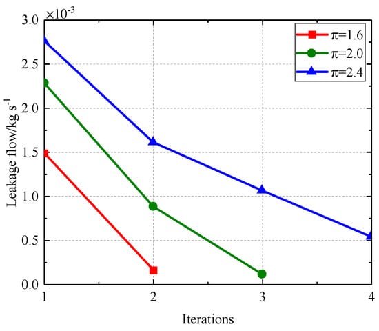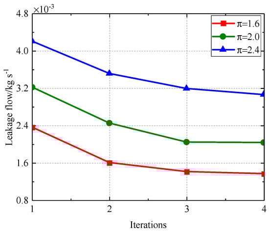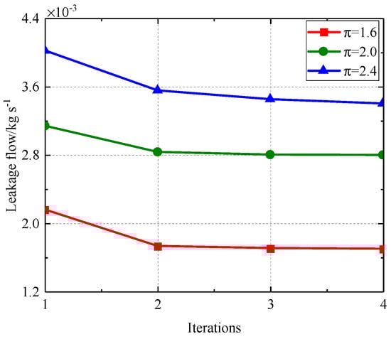Figure 35, Figure 36, Figure 37 and Figure 38 illustrate that as the pressure ratio escalates during iteration towards a stable state, the radial deformation of the labyrinth disc progressively diminishes, the sealing gap of the outer ring labyrinth decreases, and the sealing gap of the inner ring labyrinth increases, while the end labyrinth gap remains unchanged. The leakage flow rate escalates with an increase in pressure ratio, whereas the temperatures of both the fluid and solid domains diminish as the pressure ratio rises. The rationale is akin to the enhanced configuration A, which is not reiterated.
