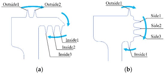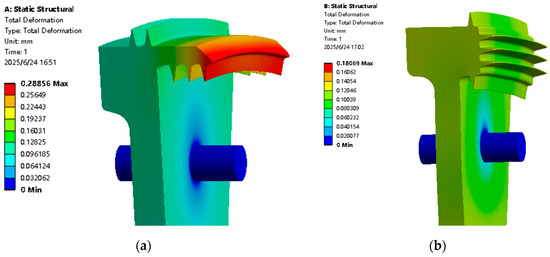 Figure 26 illustrates the simulation results of centrifugal deformation for several enhanced designs. The calculation results indicate that the largest deformation of configuration A occurs at the cantilever end, with a maximum deformation of 0.289 mm at that location. The deformation of the outer ring labyrinth measures 0.097 mm and 0.105 mm, while the deformation of the inner ring labyrinth measures 0.162 mm, 0.210 mm, and 0.258 mm, respectively. The maximum distortion of configuration B occurs at the terminal end of the cantilever of the labyrinth plate. The maximum deformation of the end labyrinth is 0.106 mm, the outer ring labyrinth is 0.104 mm, and the inner ring labyrinth is 0.099 mm.