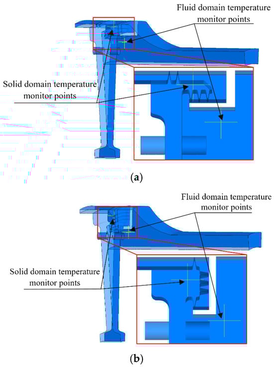 Temperature changes in conventional structures’ domain’s monitoring points (cold clearance of 0.5 mm). (a) Variations in temperature throughout the fluid domain, and (b) variations in temperature within the solid domain.