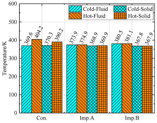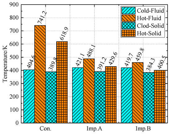 The leakage and temperature increase of various constructions with a 0.5 mm cold gap are illustrated in Figure 39 and Figure 40. Figure 39 illustrates that, with a 0.5 mm cold gap, the conventional hot leakage flow rate decreases by 45.2% relative to the cold leakage flow rate. The hot flow rate of improved structure A is 4.61% compared to the cold flow rate, while improved structure B exhibits a hot flow rate that is 1.44% relative to the cold flow rate. Figure 40 illustrates that, at a cold state gap of 0.5 mm, the temperature of the typical fluid domain exceeds the cold state by 9.38%, whereas the temperature of the solid domain surpasses the cold state by 5.39%. Relative to the cold state, the temperature of the fluid domain in the enhanced structure A has risen by 0.27%, while the temperature of the solid domain has increased by 0.28%. The temperature of the fluid domain in the enhanced structure B is 0.17% elevated compared to the cold state, whereas the temperature of the solid domain is 0.05% elevated relative to the cold state.