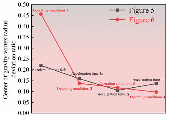 4.2. Deviation Ratio of the Vortex Radius of the Center of Gravity of the Cage