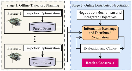 To accomplish the cooperative approach task for the pursuers, a cooperative game negotiation strategy is proposed, which is a dual-stage decision-making method that includes offline trajectory planning and online distributed negotiation. Figure 1 illustrates the cooperative game negotiation strategy.