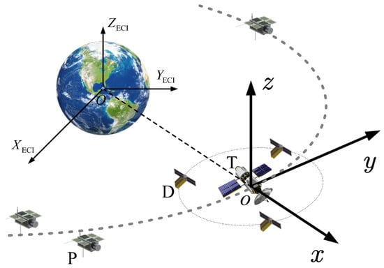 To describe the motion of the pursuers  and the defenders  relative to the target , an LVLH coordinate system is established at the center of the target, as shown in Figure 2. The origin o is located at the center of mass of the target. The x-axis extends from the Earth’s center to the target’s barycenter, the y-axis is perpendicular to the x-axis within the orbital plane, oriented positively towards the direction of flight, and the z-axis aligns with the normal of the target’s orbital plane. Additionally, the Earth-Centered Inertial (ECI) coordinate system is defined with its origin O at the Earth’s mass center.