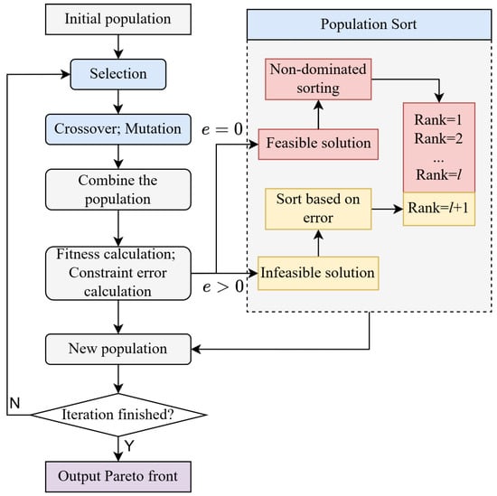 During population sorting, solutions are first divided into feasible and infeasible based on whether e equals zero. Feasible solutions are sorted using the non-dominated sorting method, while infeasible solutions are ordered in ascending degree of constraint violation and positioned after the feasible ones. The flowchart of NSGAII-CDP is shown in Figure 3.