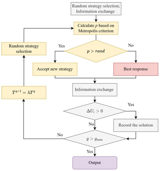 However, due to factors such as incomplete information decision-making and the mutual influence of strategies, it is challenging to converge the global optimal solution. Therefore, a distributed cooperative game negotiation strategy with a simulated annealing mechanism is designed to escape from local optima and search for better solutions. The process of simulated annealing cooperative game negotiation is shown in Figure 4.