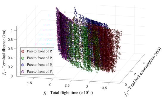 First, the NSGAII-CDP algorithm is applied to solve the MOOP, and the relationship between different optimization objectives in the (21) is obtained, namely, the Pareto front. Figure 6 illustrates the Pareto front derived from trajectory optimization for each pursuer.