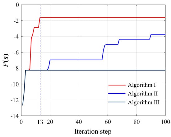 Subsequently, a distributed cooperative game negotiation strategy based on simulated annealing (Algorithm ) is employed to iteratively optimize the cooperative strategy in order to achieve a comprehensive optimal solution. To demonstrate the superiority of Algorithm , comparisons were made with a random negotiation strategy (Algorithm ) and a traditional negotiation strategy (Algorithm ), respectively. As shown in Figure 7, the changes in the potential function of Equation (30) during the iterative process are presented. The analysis shows that Algorithm  converges to a local minimum but becomes trapped, failing to discover superior solutions. Although Algorithm  can effectively escape local optima, its optimization efficiency and performance are both inferior to those of the proposed Algorithm . The corresponding Pareto optimal solution set for the pursuers is presented in Table 5.