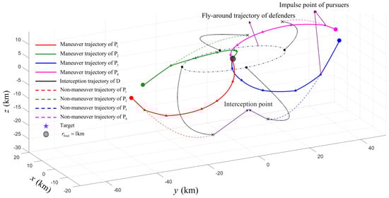 An integrated analysis of Table 5 and Table 6, along with Figure 8, Figure 9 and Figure 10, reveals the following: (1) Without executing any maneuvers, the pursuers would be intercepted by the defenders. (2) By performing the specific maneuver sequence, the pursuers successfully avoided the defenders and successfully approached the target. (3) At the terminal time, the pursuers satisfied the mission’s terminal constraints, with the terminal distance and relative velocity being within the limits (). (4) The maneuver time intervals and velocity increments adhered to the predefined constraints. Moreover, the total flight time and total fuel consumption did not exceed the mission requirements. (5) For all pursuers, the total flight times were nearly identical.