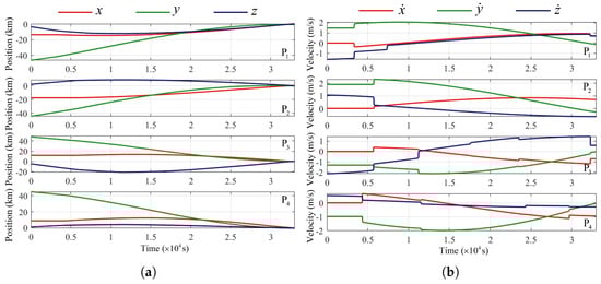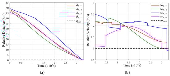 Furthermore, Table 6 presents the orbital maneuver strategies corresponding to the Pareto optimal solutions shown in Table 5, including the time intervals  between consecutive impulses and the velocity increments  in the ECI coordinate system. Figure 8 illustrates the relative motion trajectories of multi-spacecraft. It shows the interception trajectories after the defenders execute the maneuver scheme described in Table 2, as well as the avoidance and approach trajectories resulting from the orbital maneuver scheme in Table 6 executed by the pursuers. Figure 9 shows the changes in the relative state during the approach process of the pursuers. Specifically, Figure 9a,b represent the variations in three-axis relative position and velocity, respectively. In addition, Figure 10a,b illustrate the changes in distance and velocity of the pursuers relative to the target.