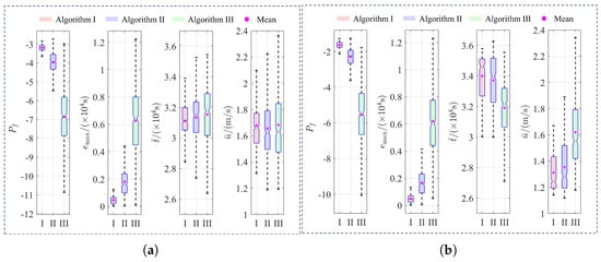 Based on the data from Figure 11 and Table 7, the distribution of potential function values and statistical results indicate that the simulated annealing distributed negotiation strategy demonstrates significantly better optimization performance compared to the traditional strategy. In Case 1, Algorithm  achieved  and  improvements in the mean value of  compared to Algorithm  and Algorithm , respectively. In Case 2, the mean value of  of Algorithm I increased by  and , respectively. These results demonstrate that the simulated annealing negotiation strategy proposed in this study delivers superior optimization efficiency. Moreover, the standard deviation and range of extreme values for the simulated annealing strategy indicate a more concentrated distribution of , stronger optimization depth, and greater stability and robustness. Additionally, the simulated annealing strategy exhibits a clear advantage in controlling the maximum approach time difference , with a lower mean value and reduced variability, effectively enhancing the coordination capability of multi-spacecraft. Further analysis of  and  data reveals that longer total flight times result in lower total fuel consumption, and vice versa. In practical applications, the choice of specific weighting schemes should be balanced based on mission requirements.