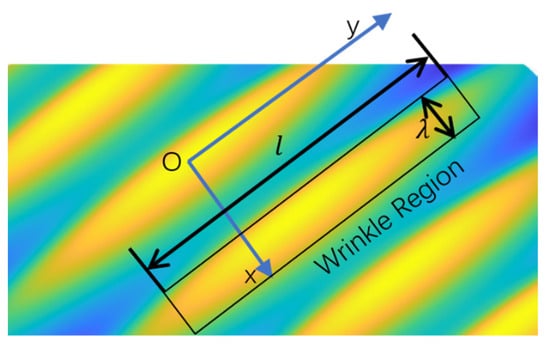 In the equation, denotes the bending energy of the film, w denotes the out-of-plane deformation (which can often be expressed as a polynomial or trigonometric function; for the wrinkle problem, w is also a function of the wrinkle wavelength λ and amplitude A, and the function mode of w could be ), D denotes the stiffness matrix , represent the length and width of the wrinkle strip, υ is Poisson’s ratio, E is Young’s modulus, and t is the structure thickness.