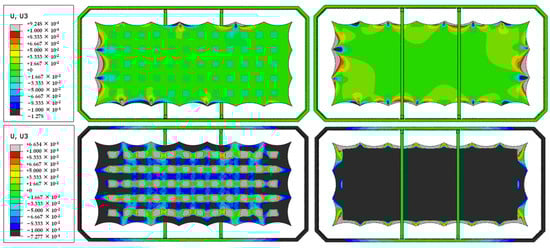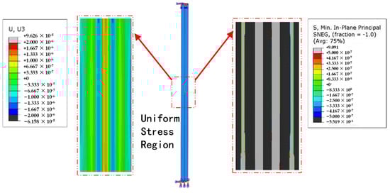 To validate the analytical results, finite element simulations were conducted. In ABAQUS 2020, a film with a large aspect ratio of 1000:40 was modeled (the length was set to 1000 mm and the width was set to 40 mm), the mesh length was set at 1 mm, element type was set as S4R. Buckle analysis was analyzed firstly, and the keywords “*imperfection” were used to set the buckle mode to analyze the wrinkle results. The central region of the film was used to analyze the uniform wrinkle patterns. As shown in Figure 2, three full wrinkle wavelengths appear at the center of the sheets. Figure 2 (left) presents the out-of-plane displacement U, U3 of the tensioned membrane under axial loading, highlighting the wrinkle amplitude across the central region. Figure 2 (right) shows the distribution of the minimum in-plane principal stress (SNEG), which captures the compressive stress concentrations induced by wrinkling. Using the material parameters—a film thickness of 50 µm and Young’s modulus of 3 Gpa—as well as the loading boundary, a tensile load of 58 N, Equation (11) predicts a wavelength of 11.89 mm. Since the specimen width is 40 mm, only three complete wrinkle wavelengths can be accommodated across the membrane. This geometric constraint directly fixes the number of wrinkles at n = 3. This result matches the simulation results and confirms the validity of the approach (10.96 mm in ABAQUS results). For an infinitely long film, the amplitude A can only be determined by substituting the deflection profile into the energy expression to find its extremum, since in Equation (8), any choice of A does not affect the derivative’s root.