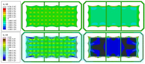 Displacement contour of the thin film with a 5 × 3 catenary array (Left: upper membrane; Right: lower membrane; Up: under equivalent tension force of 0.5 N; Below: under equivalent tension force of 2.1 N).