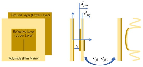 Combining the thin-film antenna deformation characteristics shown in Figure 4 and Figure 5, it can be seen that the upper antenna exhibits more pronounced local deformations with the periodic features of the repeating array units. In contrast, the patch area of the lower antenna shows small-amplitude, uniformly distributed deformations. Therefore, to analyze how structural deformation affects the antenna’s electrical performance, one can focus on a representative unit—namely, a single patch element of the antenna. Furthermore, given the deformation magnitude of the upper film, the out-of-plane deformation of the lower film may be neglected for a simplified analysis.