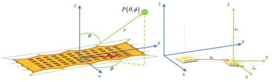 The coordinate system used for analyzing the far-field electrical performance of the phased array antenna is given in Figure 8. According to the theory of antenna design and analysis, the formula for calculating the field strength at point P is shown in the following equation [18].