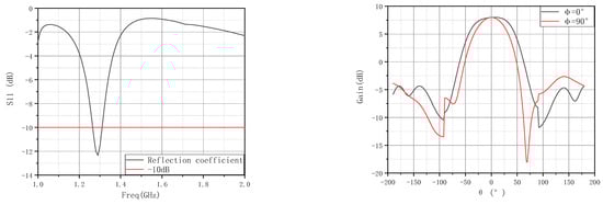 The simulation results are shown in Figure 9. It can be seen that the reflection coefficient S11 achieves a good matching depth at 1.3 GHz, with approximately −12 dB. In both the E-plane and H-plane, the antenna attains a gain level of approximately 7.5 dB.