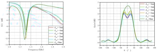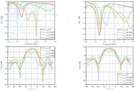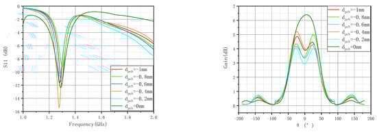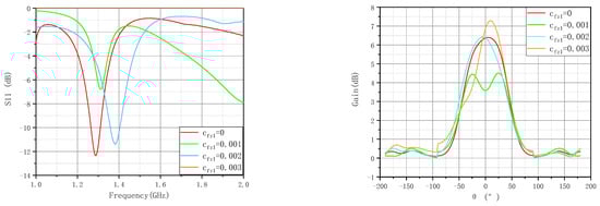 As shown in the S-parameter curves (Figure 14, second plot), as increases from 0 to 0.003, the antenna’s resonant frequency and matching shift sequentially. According to the color legend, = 0 (red line) shows a main matching dip of about −12 dB near 1.28 GHz; at = 0.0012 (orange line), the resonance shifts to ≈1.32 GHz, with a minimum of ≈−11 dB; at = 0.002 (blue line), the resonance shifts most severely to ≈1.45 GHz, with the lowest point of ≈−9 dB; and at = 0.003 (green line), the main resonance shifts back to ≈1.28 GHz, with a minimum of ≈−8.5 dB. Secondary dips near 1.63, 1.83, and 1.95 GHz (≈−6 dB, −7 dB, −10 dB) appear at = 0.0012 and 0.003, indicating that local patch deformation excites new parasitic modes. Overall, increasing causes resonant-frequency oscillation, secondary dips, and a gradual weakening of matching.