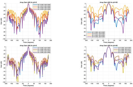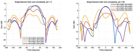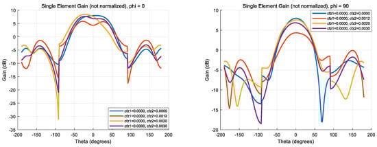 In phased array antenna systems, element errors have a significant impact on the array’s overall gain and radiation pattern characteristics. To investigate how variations in structural parameters and affect the phased array gain, simulations were performed, and the effects of different error values were analyzed in both the E-plane (ϕ = 0°) and the H-plane (ϕ = 90°), as shown in Figure 15. The results indicate that, although individual element gains do not always change dramatically under these errors, the array’s overall sidelobe levels, null depths, and main beam direction are nonetheless influenced to some extent.