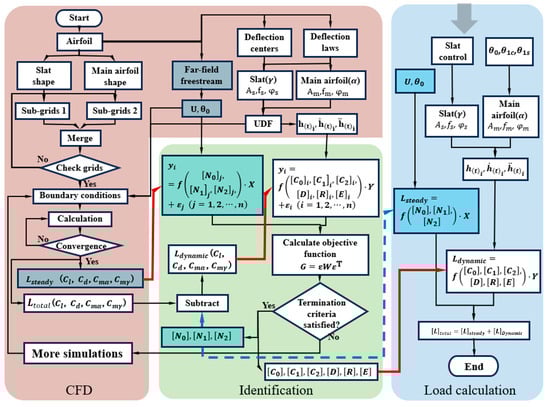 where are the steady components of aerodynamic loads, which correspond to the steady CFD results with far-field freestream (flow velocity and angle of attack ). are the dynamic components of aerodynamic loads, which correspond to the dynamic CFD results with airfoil deflections (). The computational workflow of the developed model is illustrated in Figure 1.