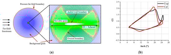 Validations of NACA0012 airfoil: (a) overlapping grids for calculations (Blue: background grids; green: component grids of airfoil; red: overset boundary grids); (b) comparison between CFD results and experimental data [30].