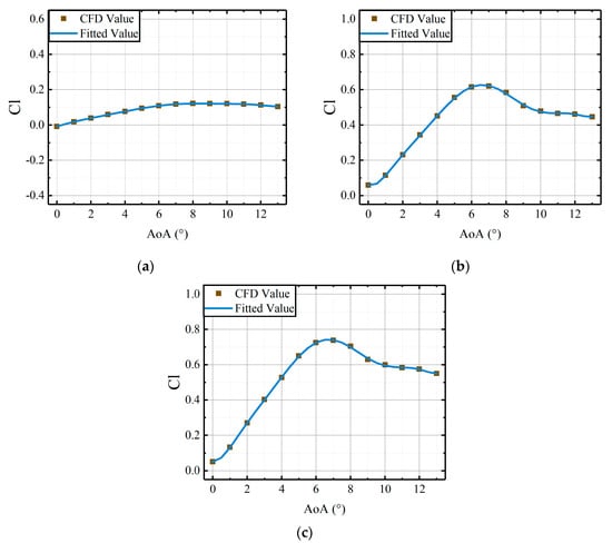 Comparisons of CFD results and the fitted results, derived from the coefficient matrices, versus AoAs of main airfoil under the steady deflections: (a) the lift coefficients of active leading edge; (b) the lift coefficients of the main airfoil; (c) the lift coefficients of the whole airfoil.
