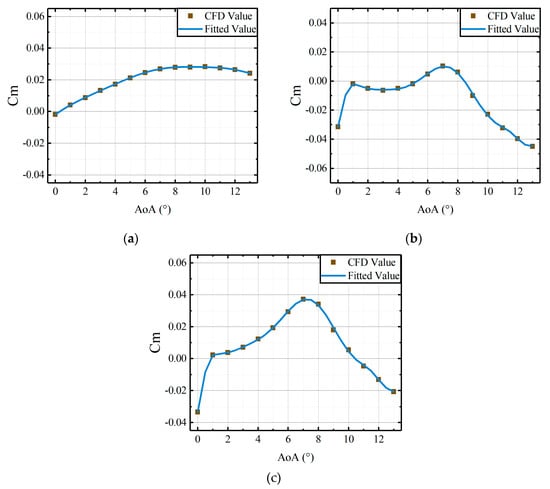 Comparisons of CFD results and the fitted results, derived from the coefficient matrices, versus AoAs of main airfoil under the steady deflections: (a) the moment coefficients of active leading edge; (b) the moment coefficients of the main airfoil; (c) the moment coefficients of the whole airfoil.