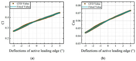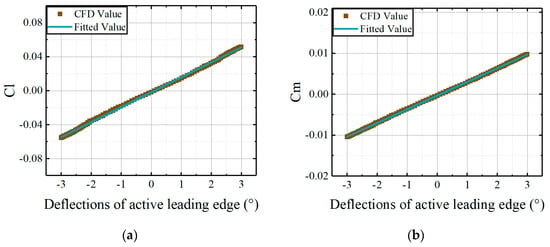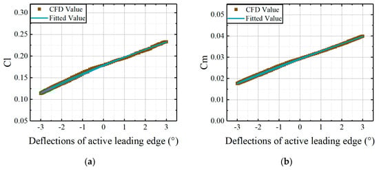 Comparisons of CFD results and the fitted results, derived from the coefficient matrices, versus deflections of the leading edge at AoA = 2.5°: (a) lift coefficients of active leading edge; (b) moment coefficients of active leading edge.