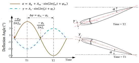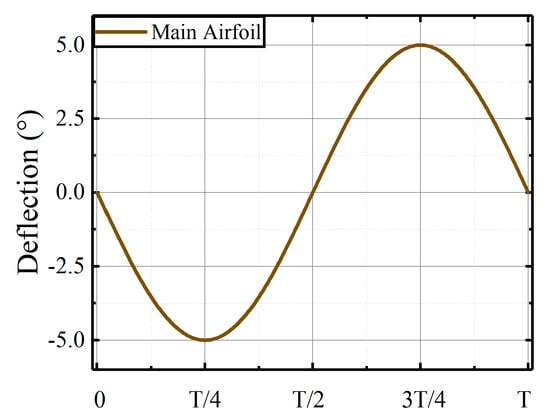 The angle of attack of the main airfoil is set as the reference. As illustrated in Figure 18, when the phase of the main airfoil is set at 0°, the airfoil executes oscillating deflections following an upward–downward sequence. At the same time, the phase of the leading edge is set at 180°, resulting in a phase difference ° between the leading edge and the main airfoil. The deflecting directions of these components become anti-phase.
