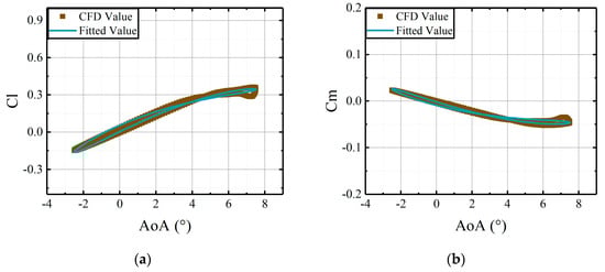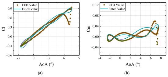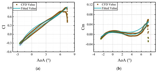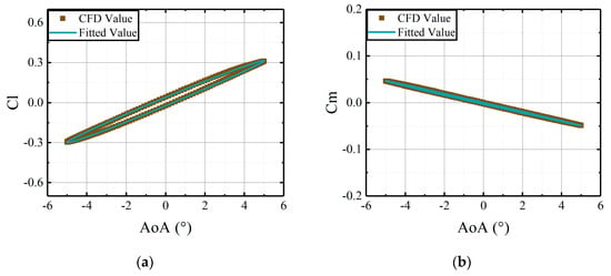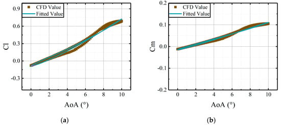 Comparisons of CFD results and the fitted results, derived from the coefficient matrices, versus deflections of the leading edge at AoA = 5°: (a) lift coefficients of active leading edge; (b) moment coefficients of active leading edge.