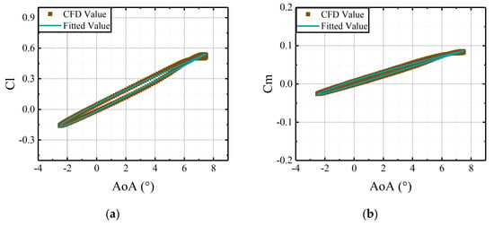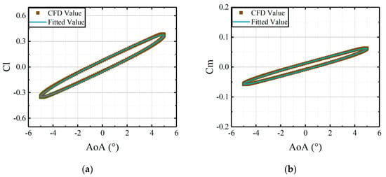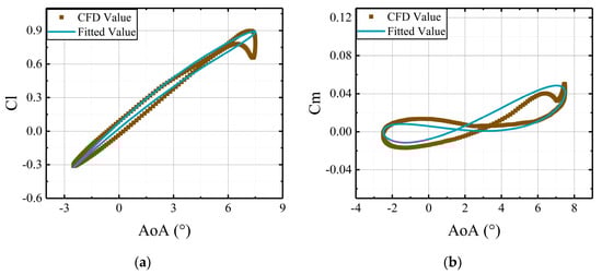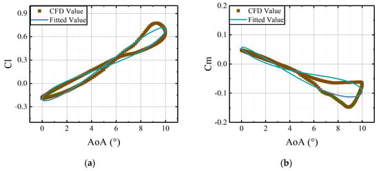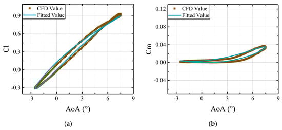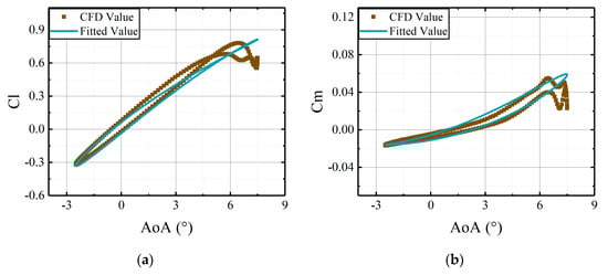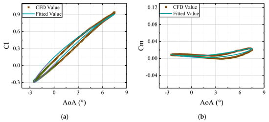 To determine the coefficient matrices , the required parameters for identification are the steady results and angles of attack of the airfoil. Under the same freestream conditions, comparisons are illustrated between the CFD results and the fitted results, derived from the identified coefficient matrices in Figure 5 and Figure 6.