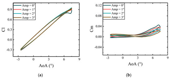 The figures reveal that the aerodynamic loads vary nonlinearly with the deflections of airfoil. As shown in Figure 22, Figure 23, Figure 24 and Figure 25, the and curves exhibit a distinct loop, which is attributed to the variations of actuation frequencies of the active leading edge. Therefore, the deflections of the active leading edge can effectively change the aerodynamic loads.