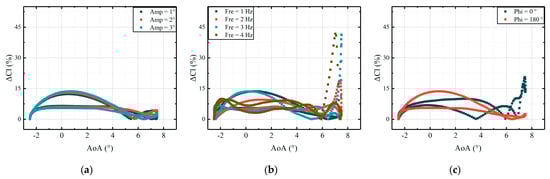 ΔCl between the CFD results and fitted results: (a) different deflection amplitudes; (b) different deflection frequencies; (c) different deflection phases.