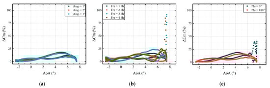 ΔCm between the CFD results and fitted results: (a) different deflection amplitudes; (b) different deflection frequencies; (c) different deflection phases.