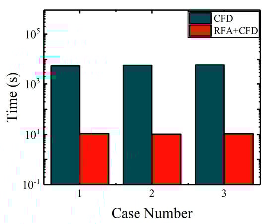 CFD simulations of dynamic cases inherently demand extended computational durations. To verify the efficiency of the developed model, the convergence time for the last cycle of dynamic simulations was quantified. The comparisons of the computational time required for last cycle between the aerodynamic model and CFD are illustrated below. In Figure 29, three deflection laws are considered. Case Numbers 1, 2, and 3 represent three deflection laws, respectively, independent leading edge deflection, main airfoil deflection, and the combined deflections of the main airfoil and active leading edge. In this study, a computer, equipped with an Intel(R) Core (TM) i7-8700 CPU @3.20 GHz, featuring a total of six cores and 32 GB RAM, was employed to perform aerodynamic calculations using both the CFD method and the developed model, respectively.