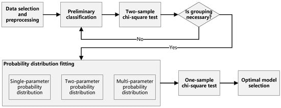 This section outlines the analytical model developed to analyze and evaluate the service duration of PWT at airports. The model comprises several critical components, including data selection and preprocessing, fitting of single-parameter, two-parameter, and multi-parameter PDs, and rigorous evaluation via the chi-square goodness-of-fit test. Through these steps, the optimal PD model for PWT service duration under various operating conditions is identified, providing a robust framework for the optimization of airport ground operations and resource allocation.