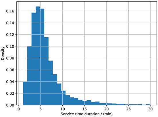 - Non-peak period (Burr distribution): The service duration data during non-peak periods were optimally modeled by the Burr distribution (Type XII). The PDF of the Burr distribution is explicitly given bywhere and are the shape parameters that control the tail behavior and flexibility, and is the scale parameter. Specifically, the maximum likelihood estimation yielded the following fitted parameter values for the Burr distribution during non-peak periods:Considering the complete dataset, the Burr distribution characterized by these parameters effectively captures the variability of service durations observed during non-peak periods, as confirmed by a chi-square goodness-of-fit test statistic of and an associated p-value of , indicating an excellent statistical fit.